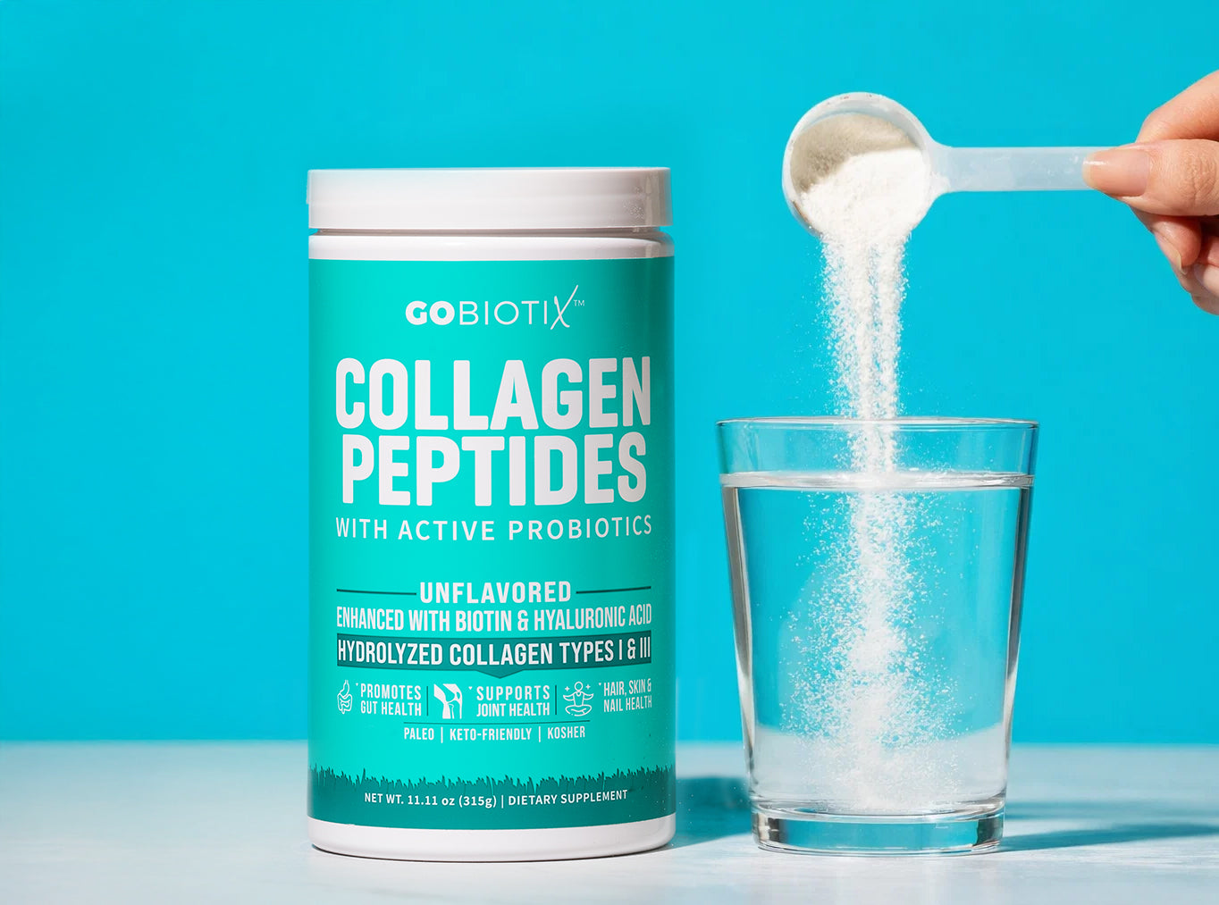 Mix one scoop of GoBiotix Collagen Peptides Powder with 8–12 oz of your favorite beverage.