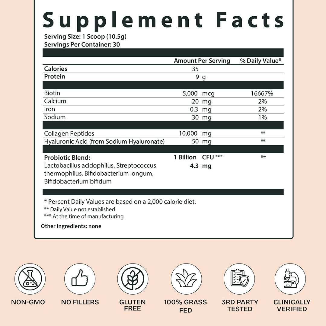 Our formula combines grass-fed collagen, biotin, hyaluronic acid, and probiotics—creating a complete, inside-out wellness solution. It’s non-GMO, dairy-free, gluten-free, and free from artificial ingredients, tested in ISO/IEC-17025 accredited labs for safety and purity.