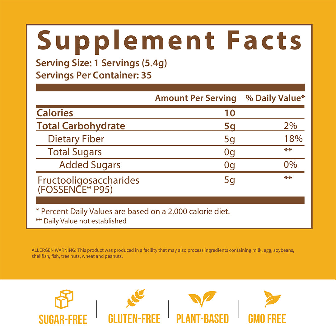 Unlike probiotics, which introduce bacteria, prebiotics like FOSSENCE® help the beneficial bacteria you already have thrive. Each serving contains 5g of fiber and zero sugar, zero net carbs, and no artificial ingredients, making it suitable for a variety of diets, including keto, vegan, and low-carb lifestyles.