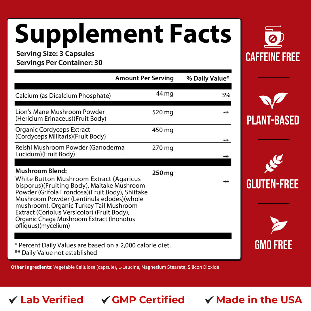 - Calcium (as Dicalcium Phosphate) Lion’s Mane Mushroom Powder, Organic Cordyceps Extract, Reishi Mushroom Powder