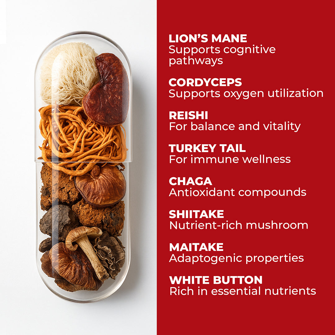 8 Mushroom complex including Lion’s Mane, Cordyceps, & Reishi