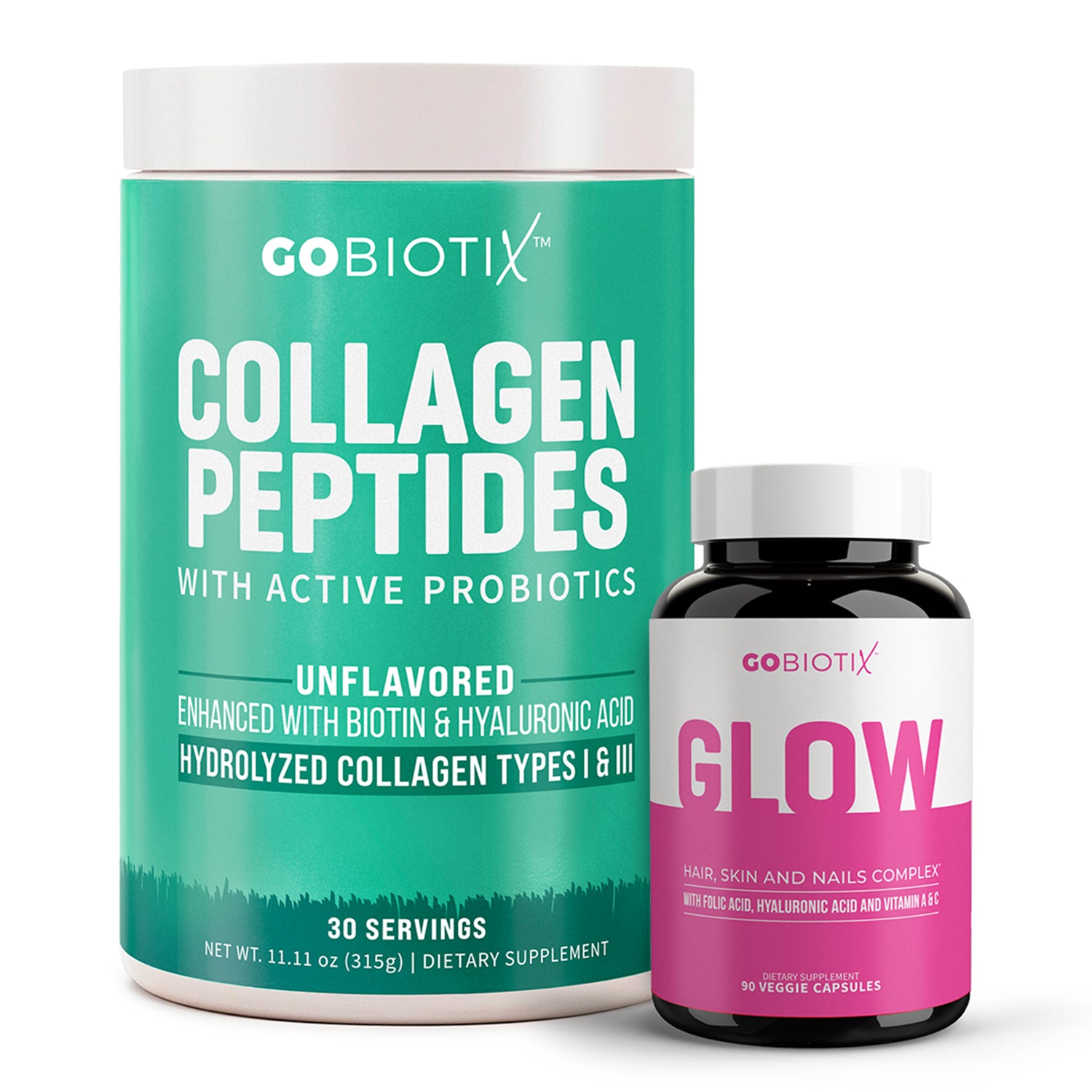 The bundle includes Glow Hair, Skin & Nails Complex capsules and Collagen Peptides with Active Probiotics powder. Together, they support hair, skin, nails, joints, digestion, and overall wellness.