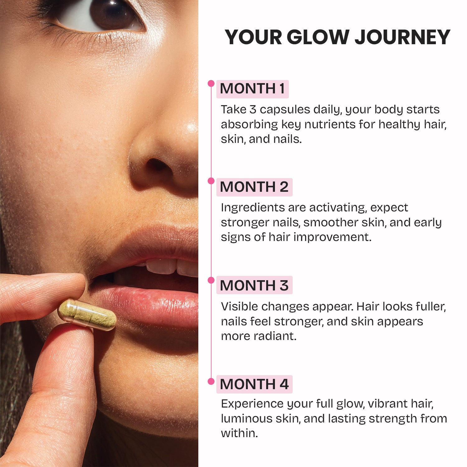 You should take 3 capsules of GoBiotix GLOW Beauty Multivitamin once daily with water. For best results, use consistently—most people begin to notice positive effects after 2 to 3 months of daily use. Continued use through months 4 and 5 may support fuller, shinier hair and improved skin and nail appearance. Make GLOW a part of your daily beauty routine for optimal benefits.