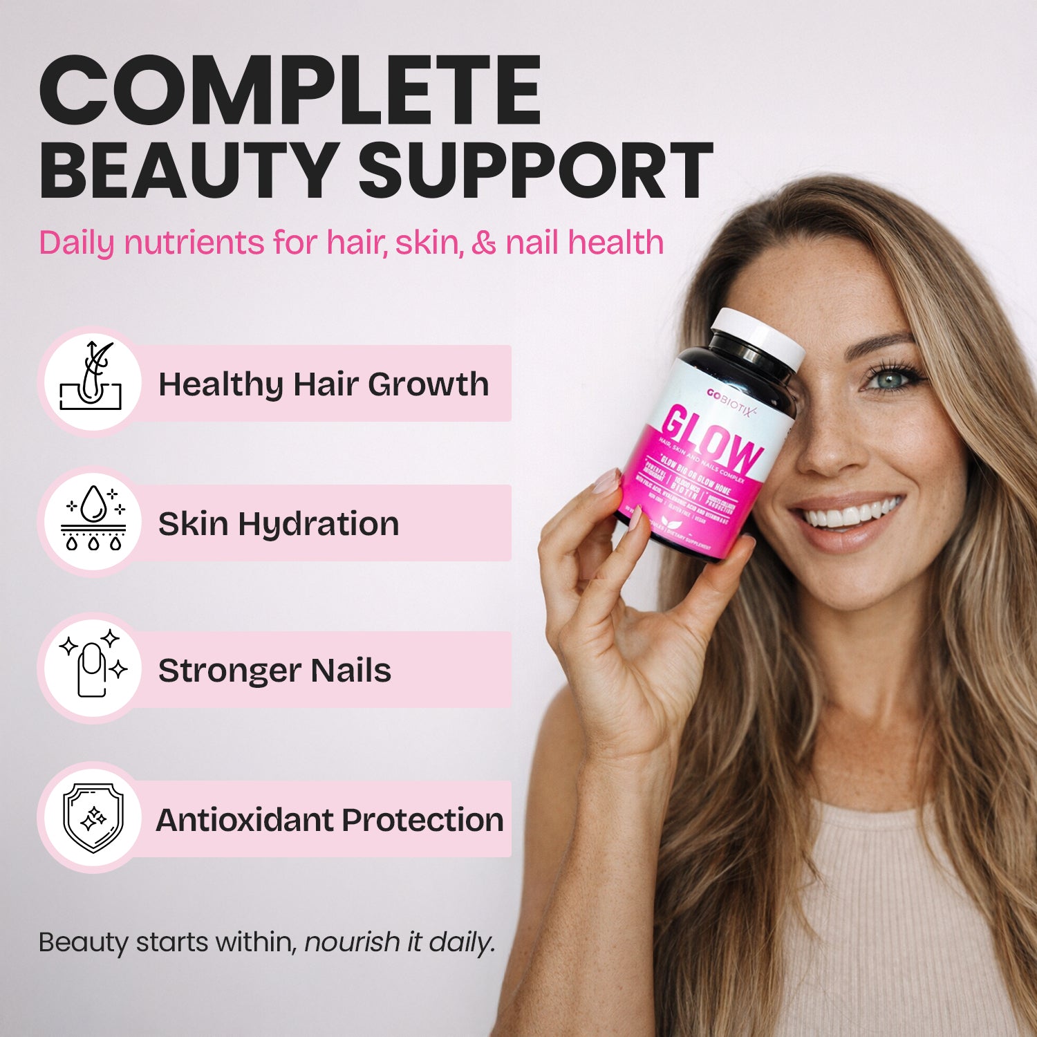 GoBiotix Glow Beauty Multivitamin is loaded with an advanced formula specifically designed to help moisturize skin and reduce wrinkles, strenghten nails, and make hair fuller and stronger. This advanced lab-engineered formula is 100% vegan, keto, sugar-free, dairy-free and Non-GMO.We only use natural ingredients in our products that are produced in an FDA-registered facility with the highest quality standards, setting GoBiotix Glow Beauty Multivitamin apart from the rest.