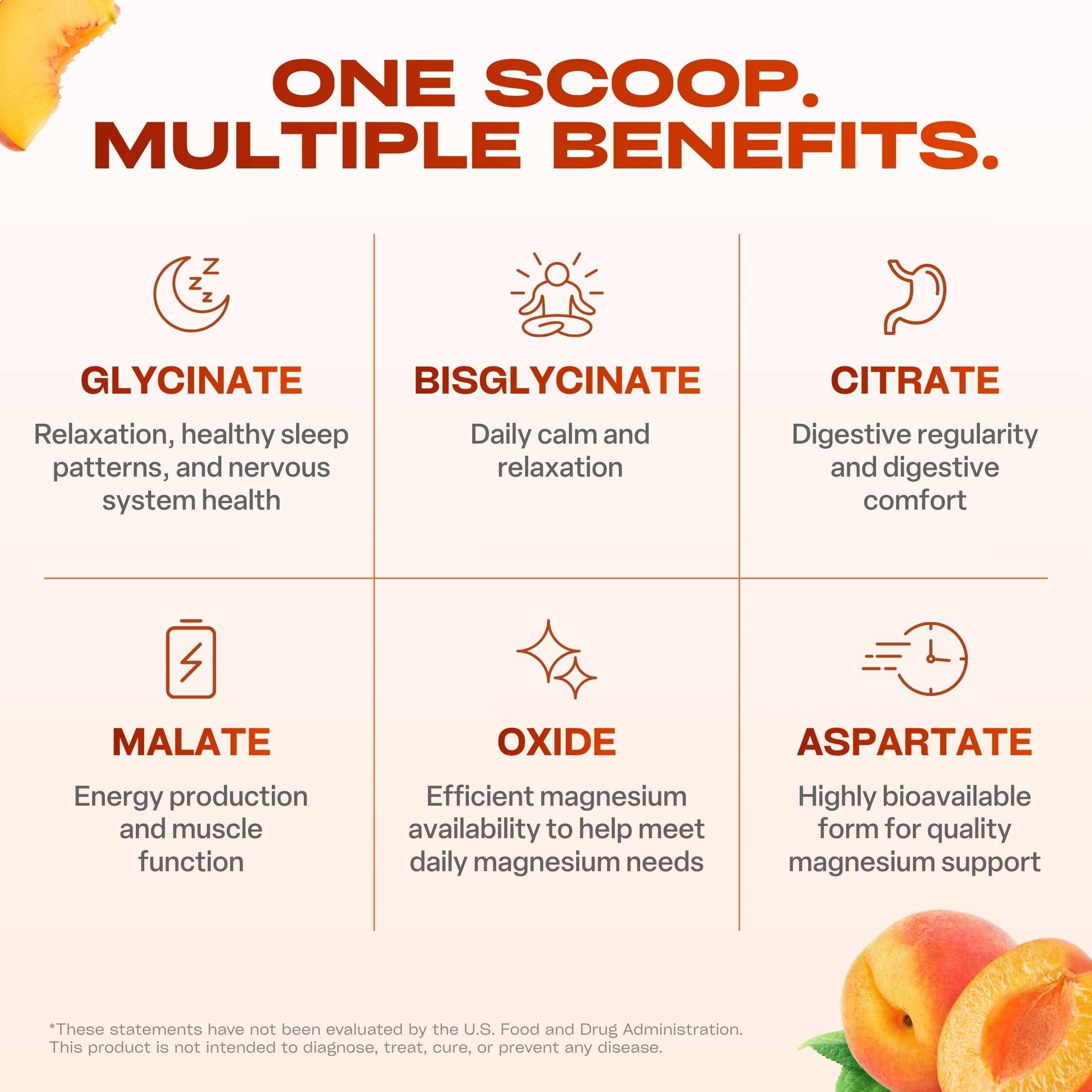 Our formula blends six forms of magnesium, including glycinate, citrate, malate, oxide, aspartate, and glycinate glutamine chelate (TRAACS®), delivering 420mg per serving for a balanced daily intake.